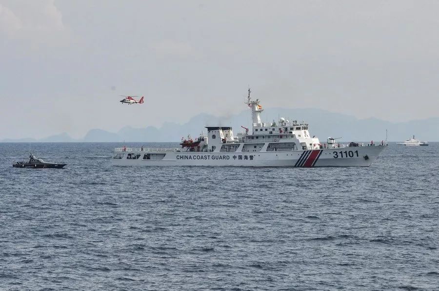 ▲资料图片:2015年5月27日,在马六甲海峡凌家卫海域,中国海警31101船进行海上搜救行动。新华社发(张纹综摄)