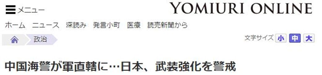 日媒称,中国海警局从7月1日开始就划归中国人民武装警察部队指挥。而中国武警部队由中央军委直接管辖。日本政府担心中国海警局和中国海军今后会进一步加强合作,不但在钓鱼岛附近加紧活动,还可能强化武装。