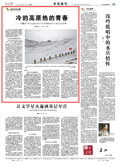 近年来,驻守在祖国西北边陲的新疆喀什军分区,紧盯练兵备战、国防施工等使命任务,有效盘活身边文化资源,使其不断融入铸魂育人、激发士气、砥砺斗志的强军实践,在雪域高原为戍边卫士构建起特色鲜明的文化家园。请关注今日出版的《解放军报》的文章——