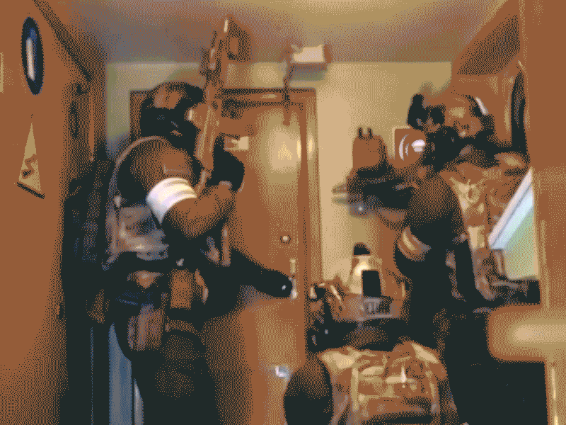 图为俄军SOBR RYS队员快速突入破冰船舰桥,击毙恐怖分子的动态图。