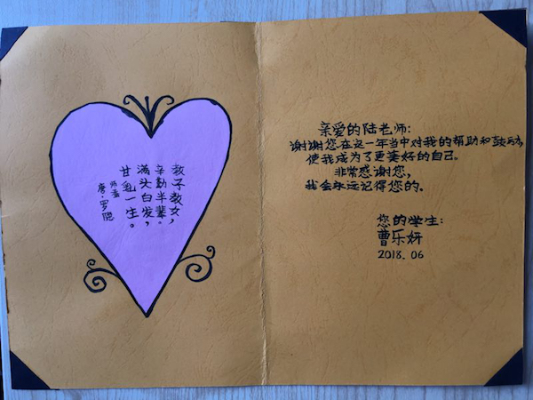 陆希蓝小朋友送给蒋老师的感恩卡。