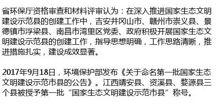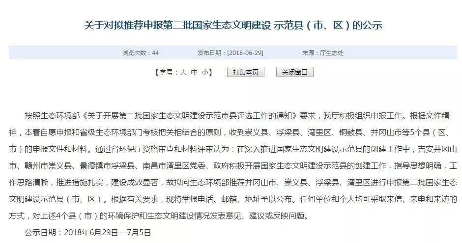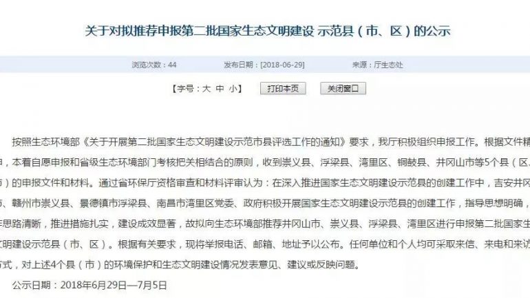 6月29日,江西环境保护厅对外公布了《关于对拟推荐申报第二批国家生态文明建设示范县(市、区)的公示》。拟向生态环境部推荐井冈山市、崇义县、浮梁县、湾里区进行申报第二批国家生态文明建设示范县(市、区)。