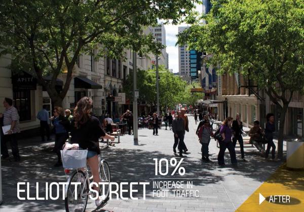 企业和业主可以从步行化中受益。在市中心地区更多的停留时间和零售收入的增加与客流量的增加有关。这些都对房地产价格产生影响,特别是在人流量大的交通枢纽或节点。美国德克萨斯州的一项研究表明,步行化程度提高1%,房产价值将提高1329美元;人行道密度提高了1%,房产价值将提高785美元。