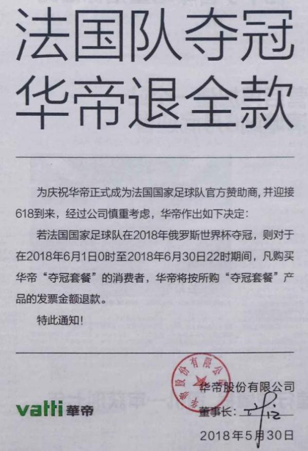 5月30日,华帝发布一则消息,称如果法国队在本次世界杯中夺冠,公司将对购买了“夺冠套餐”的消费者进行退全款活动。