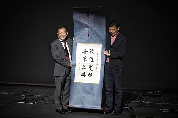新加坡华乐团行政总监何伟山向上海民族乐器一厂赠送墨宝贺仪