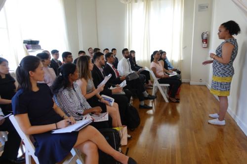 律师泰勒为参会者讲解H-1B审核情况。(图片来源:美国《世界日报》记者 金春香 摄)