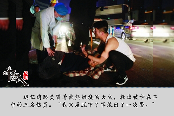 2017年3月16日晚,江西省南昌市老福山立交桥下三辆车相撞起火。驾车路过的退伍消防员许诺冒着熊熊燃烧的大火,救出了被卡在车中的三名伤员。