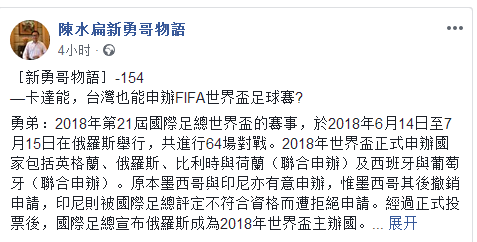 原标题:蔡英文想连任吗?陈水扁给你支招了:申办世界杯足球赛 【环球网综合报道】蔡英文想连任吗?陈水扁给你支招了:去申办一届世界杯足球赛…… 看似两者没什么联系..