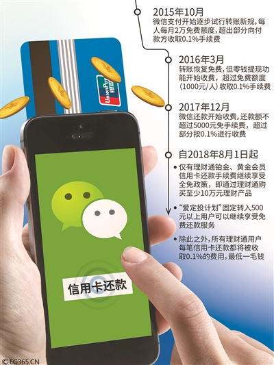 原标题:信用卡还款还有哪些通道能免费 本报讯(记者 程婕)根据微信7月初发布的公告,8月1日起除微信理财通铂金、黄金会员以及“爱定投计划”固定转入500元以上的用户可继续免..